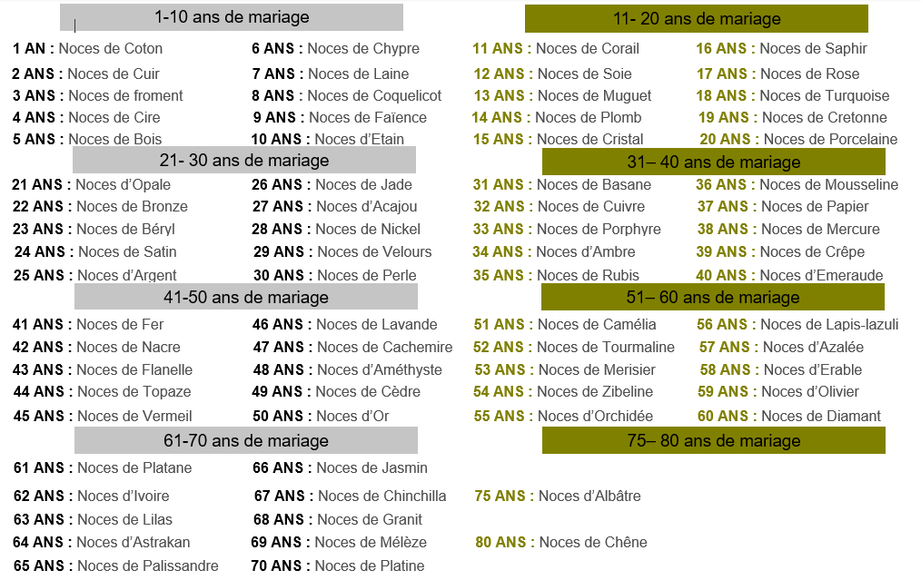 Calendrier des années de mariage